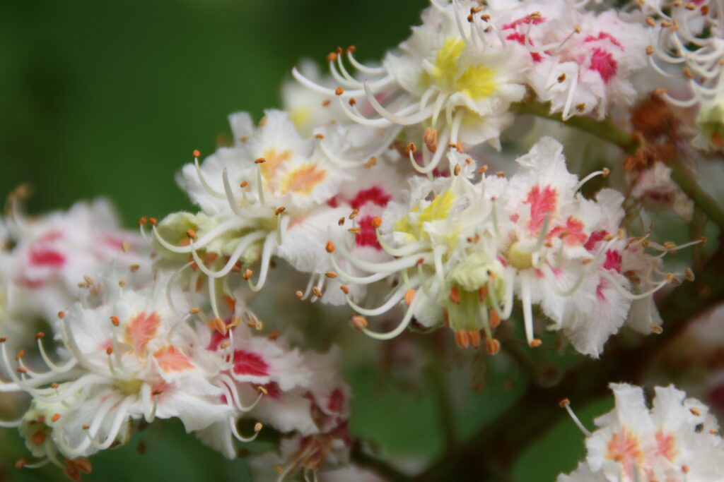 Die Kastanie bietet mit ihrer Blütenampel einen besonderen Service für die bestäubenden Insekten. Die einzelnen Blüten haben farbige Flecken. Wenn sie aufblühen, ist dieser Fleck bei allen Blüten gelb. Der Fleck ändert nach der Bestäubung seine Farbe von gelb über orange zu rot.